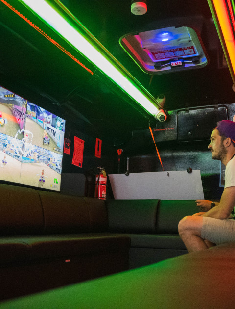It is fitted out with state-of-the-art equipment, including WiFi, music and DJ equipment, gaming consoles, art equipment, sports equipment including a mobile basketball ring and soccer goals, and five LCD screens inside and an outdoor LCD screen which can be utilised for gaming and movies, and more.