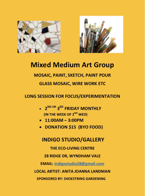 The Mixed Medium Art Group is held on the 2nd (occasionally the 3rd) Friday of each month at The Eco-Living Center, 28 Ridge Drive, Wyndham Vale in the Indigo Studio.